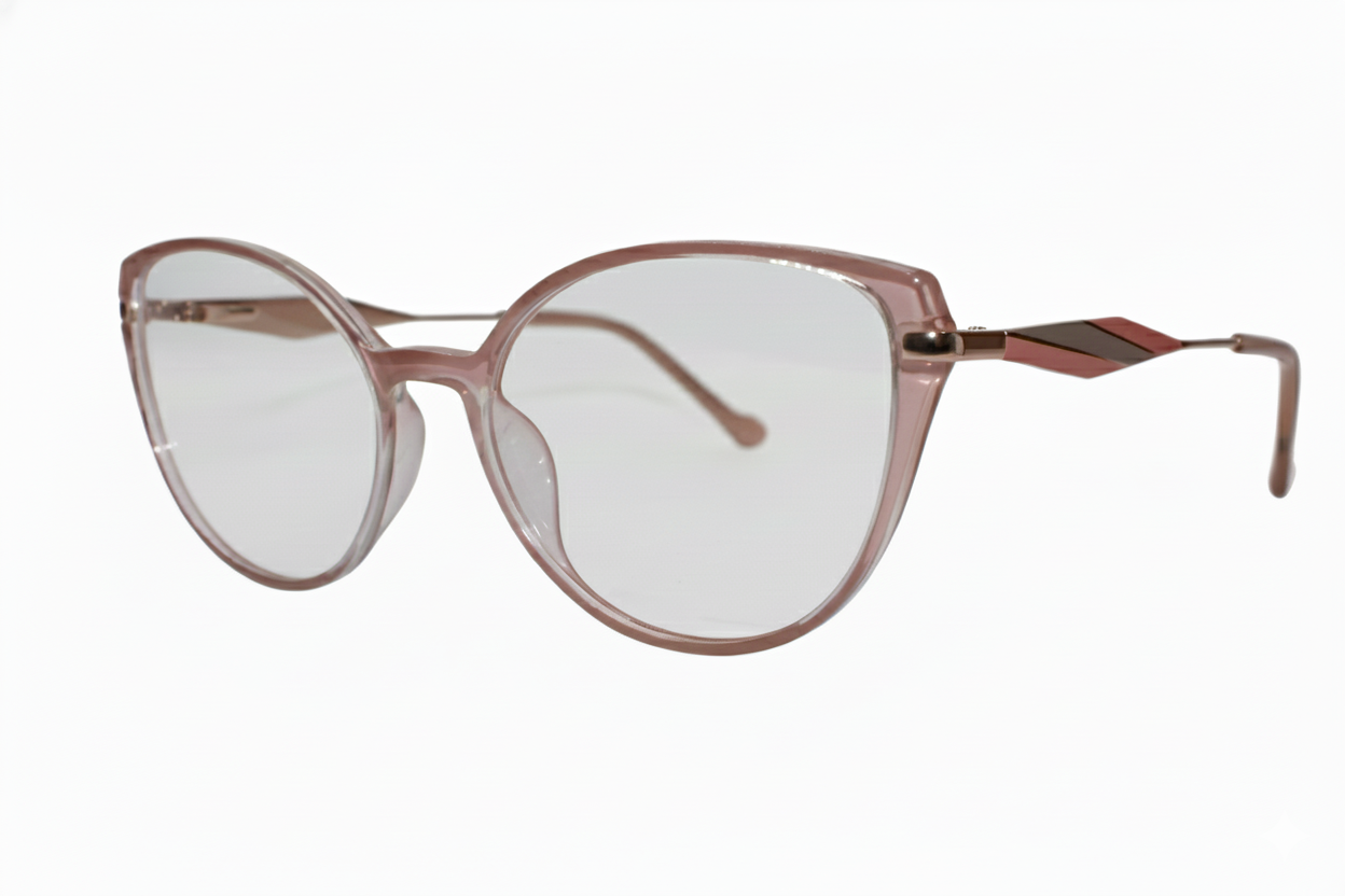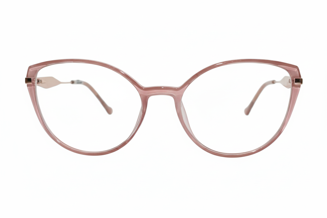Montura de gafas en color rosa translúcido, con diseño redondeado estilo ojo de gato, ligera, moderna y perfecta para un look femenino y elegante.