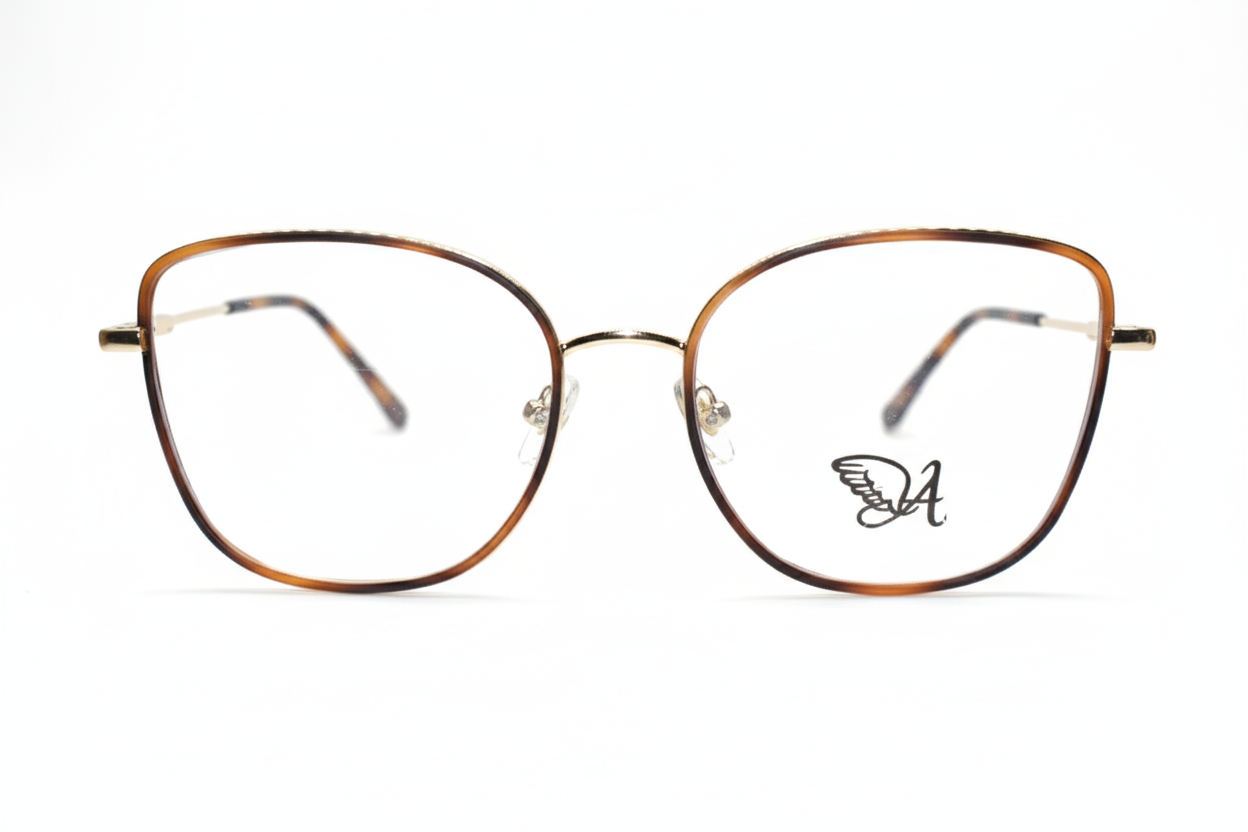 Eleva tu estilo con esta montura Cat-eye de diseño mariposa, la definición de la feminidad sofisticada. Su elegante marco en metal Dorado Brillante se complementa a la perfección con el toque de distinción que aporta el borde superior recubierto de acetato Carey.