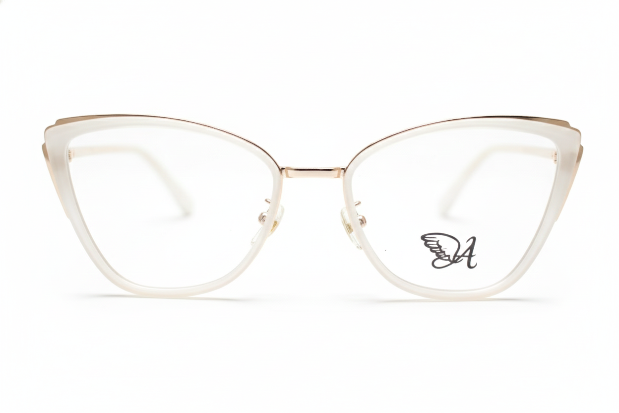 Esta espectacular montura captura la esencia del estilo retro-chic con su atrevida forma Ojo de Gato (Cat-Eye) y su moderno acabado en acetato blanco. La silueta vintage está enmarcada por un sutil detalle metálico Dorado en la parte superior, dándole un toque de lujo sofisticado.